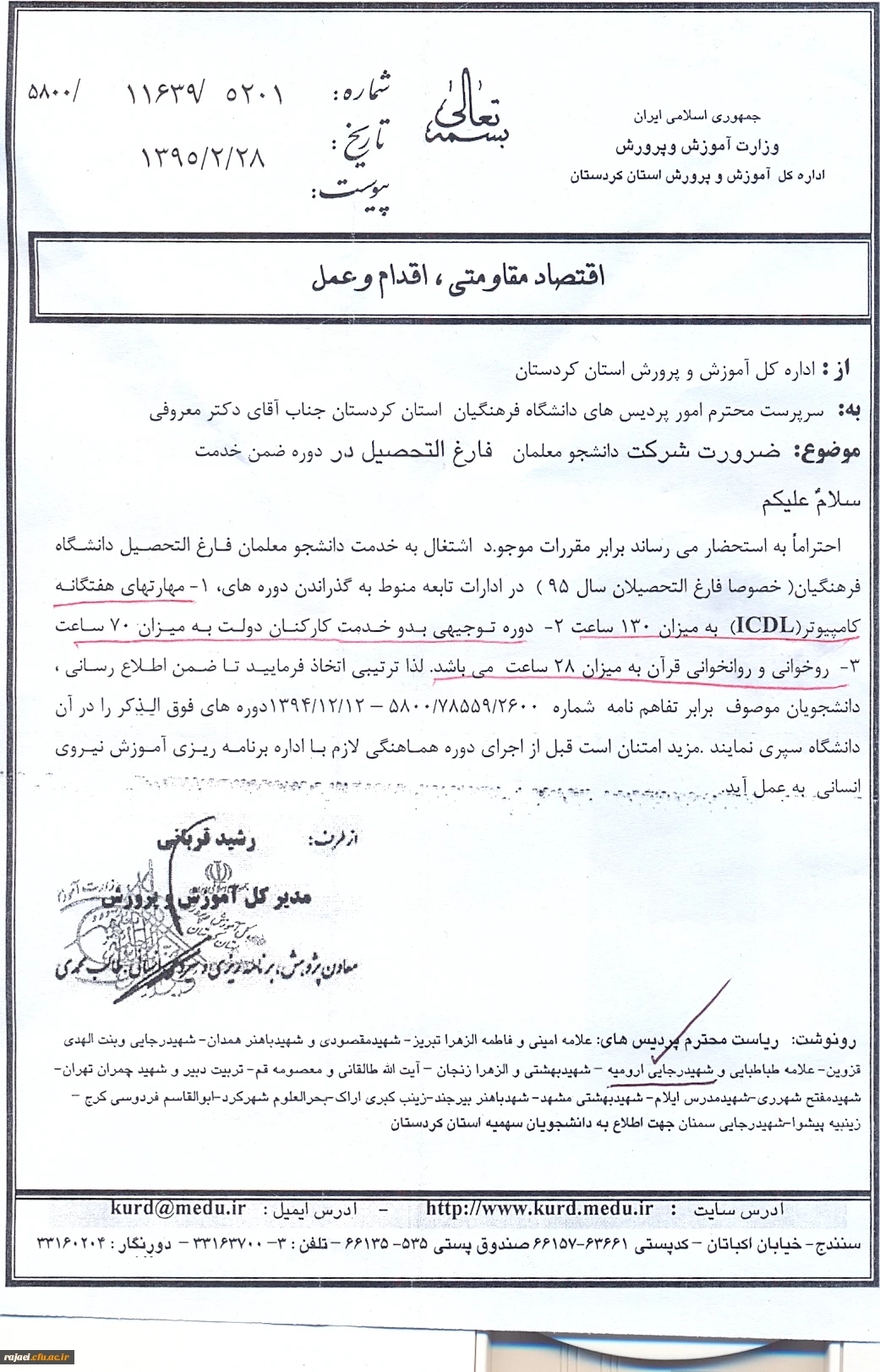 قابل توجه دانشجو معلمان کارشناسی پیوسته که محل خدمت آنها استان کردستان می باشد. 2