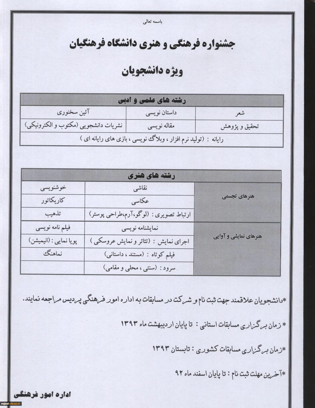 امتیاز دهید : فراخوان ثبت نام در جشنواره مسابقات فرهنگی و هنری دانشگاه فرهنگیان دوشنبه 7 بهمن 1392 ساعت 12:50