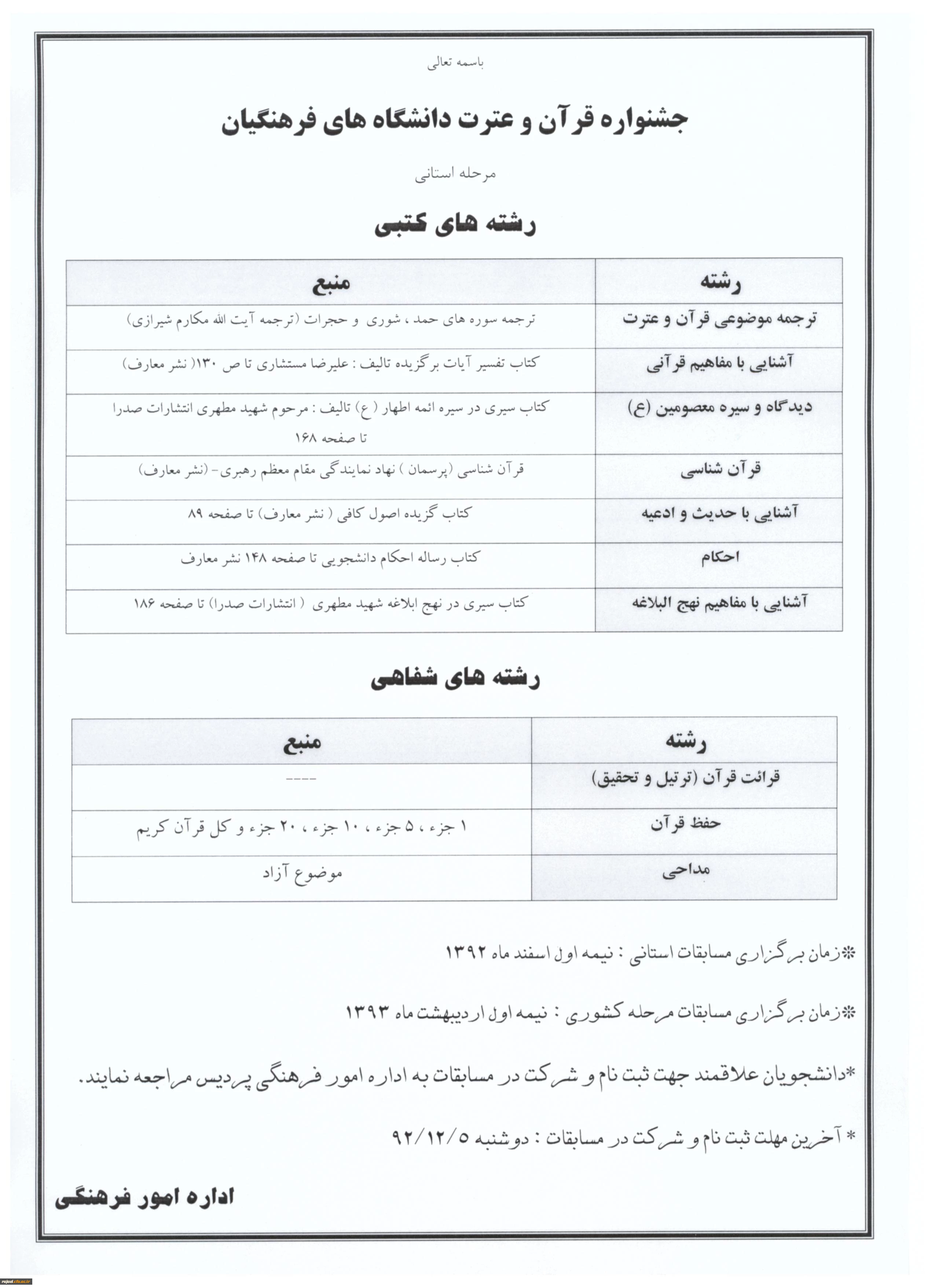 امتیاز دهید : فراخوان ثبت نام در جشنواره مسابقات قرآن و عترت دانشگاه فرهنگیان چهارشنبه 9 بهمن 1392 ساعت 13:29
