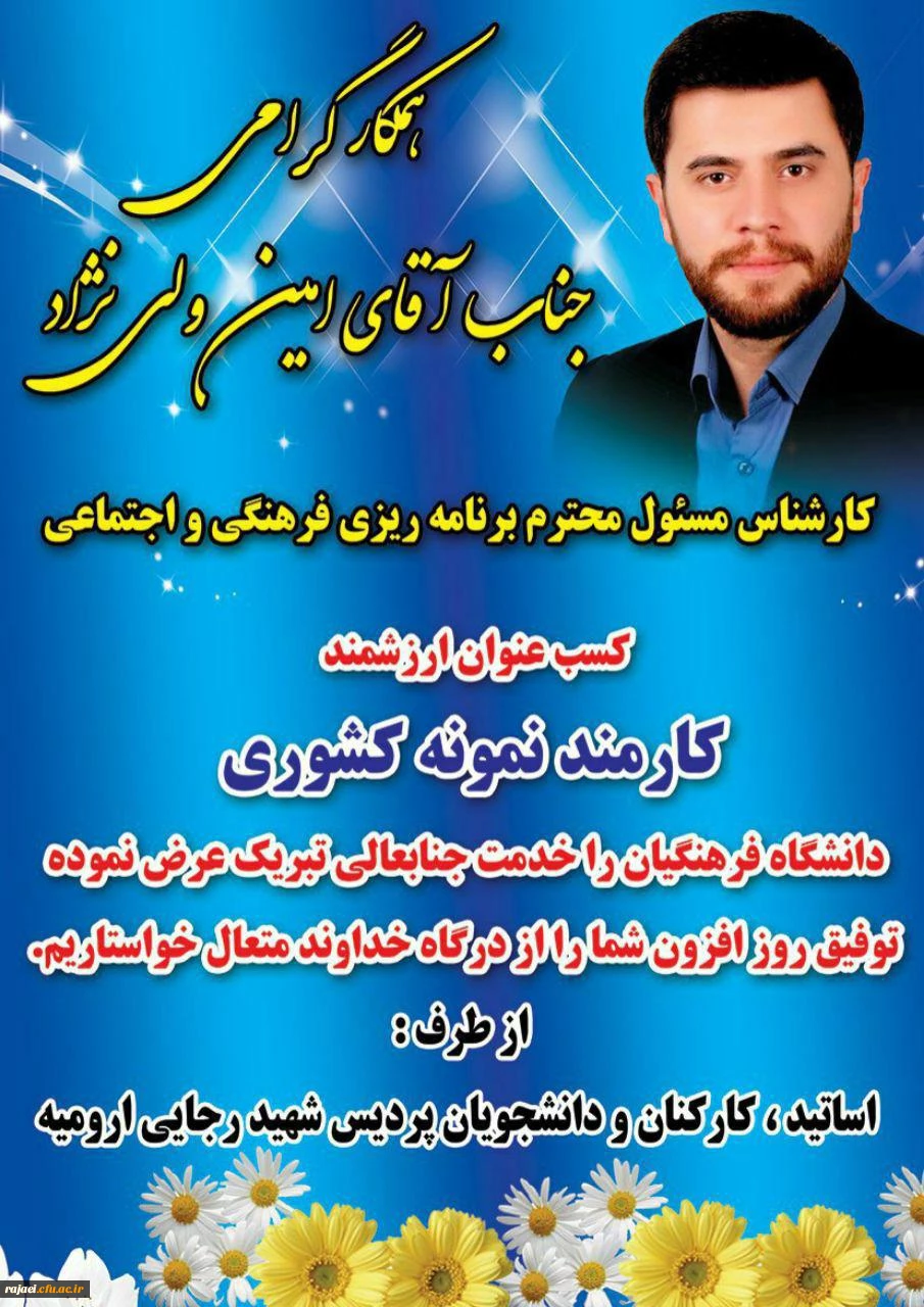 افتخاری دیگر برای دانشگاه فرهنگیان استان و پردیس شهید رجایی ارومیه انتخاب جناب آقای ولی نژاد به عنوان کارمند نمونه کشوری