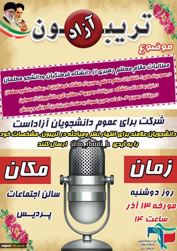 امتیاز دهید : تریبون آزاد با موضوع مطالبات رهبری از دانشگاه فرهنگیان و دانشجو معلمان دوشنبه 13 آذر 1396 ساعت 15:22