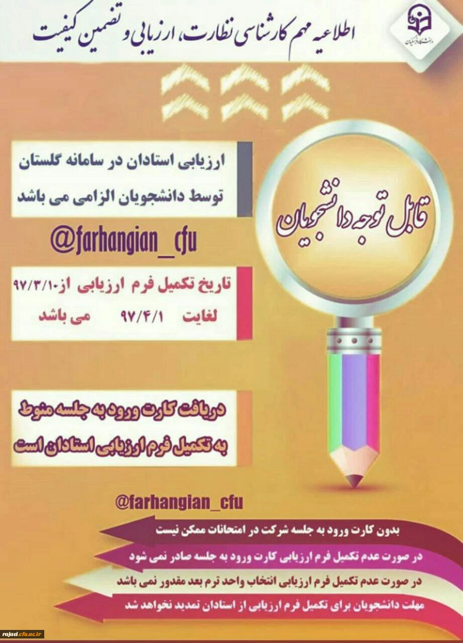 اطلاعیه مهم کارشناسی نظارت، ارزیابی و تضمین کیفیت در خصوص ارزشیابی استادان و نظر سنجی از کیفیت برگزاری دوره ی آموزشی در سامانه گلستان