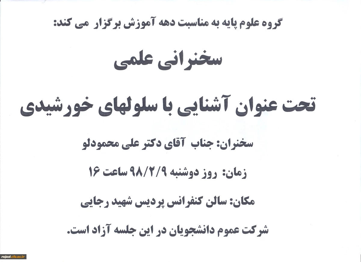 گروه علوم پایه به مناسبت دهه آموزش برگزار می کند: سخنرانی علمی تحت عنوان:(( آشنایی با سلولهای خورشیدی)) 2
