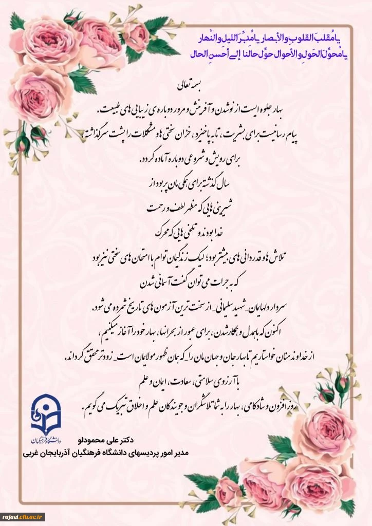 پیام تبریک دکتر محمودلو سرپرست امور پردیس های دانشگاه فرهنگیان استان آذربایجان غربی به مناسبت حلول سال جدید