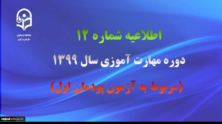 امتیاز دهید : اطلاعیه شماره 12 دوره مهارت آموزی سال 1399 (مربوط به آزمون پودمان اول) یکشنبه 15 تیر 1399 ساعت 13:03