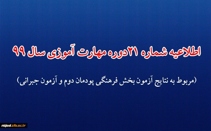 اطلاعیه شماره 21 دوره مهارت آموزی حوزه فرهنگی و اجتماعی سال 99 (مربوط به نتایج آزمون بخش فرهنگی پودمان دوم و آزمون جبرانی)