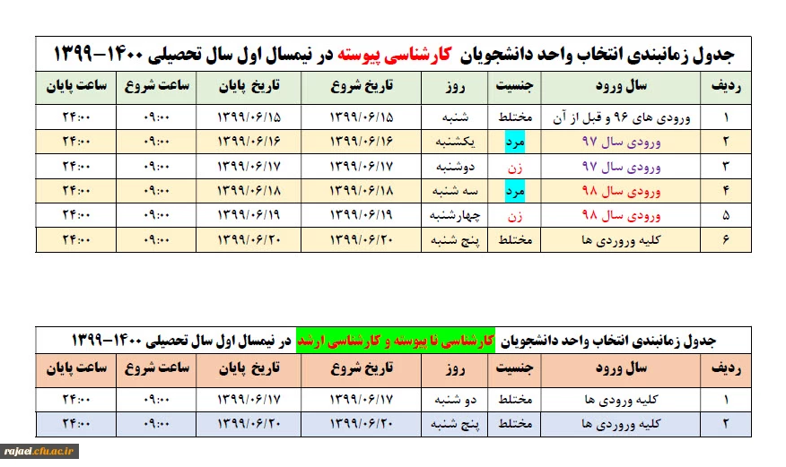 جدول زمانبندی انتخاب واحد دانشجویان کارشناسی پیوسته،ناپیوسته و ارشد در نیمسال اول سال تحصیلی 1400-1399 2