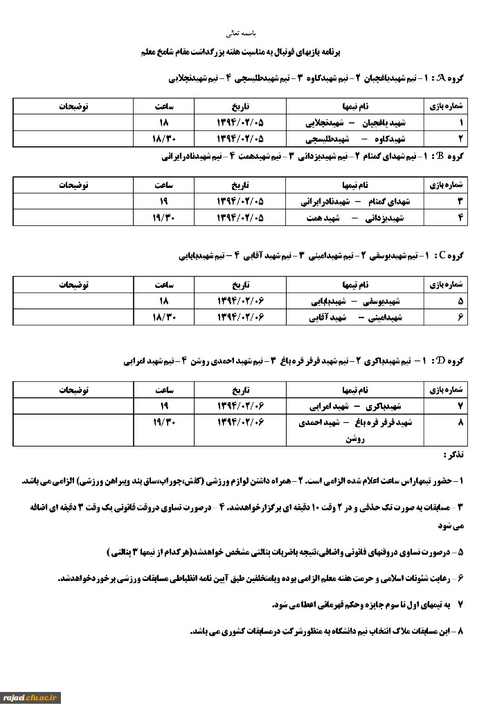 امتیاز دهید : برنامه بازیهای فوتبال و والیبال به مناسبت هفته بزرگداشت مقام شامخ معلم 2 یکشنبه 6 اردیبهشت 1394 ساعت 12:45