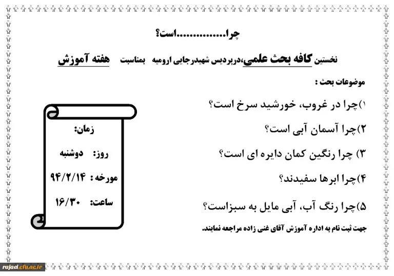 امتیاز دهید : به مناسبت هفته آموزش نخستین کافه بحث علمی،درپردیس شهیدرجایی ارومیه 2 سهشنبه 8 اردیبهشت 1394 ساعت 14:15