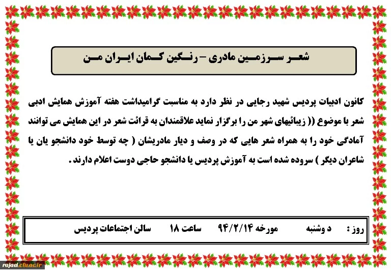 کانون ادبیات پردیس شهید رجایی برگزار می کند: همایش ادبی شعر با موضوع زیبائیهای شهر من 2